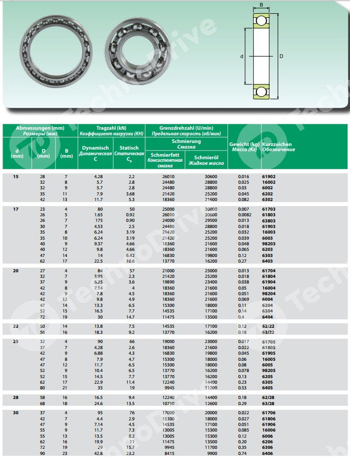 | Предельная скорость (консистентная смазка), об/мин | 15300 |
